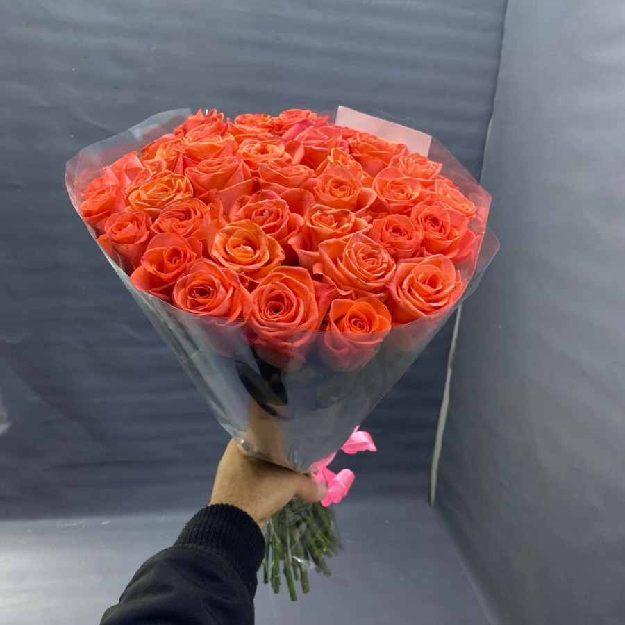 На фото букет из 29 коралловых роз. В составе: роза 29 шт, дизайнерская упаковка 1 шт, атласная лента 1 шт, . Все цветы свежие и ароматные, букет красиво оформлен и отлично подходит для подарка. Доступна доставка цветов или самовывоз.